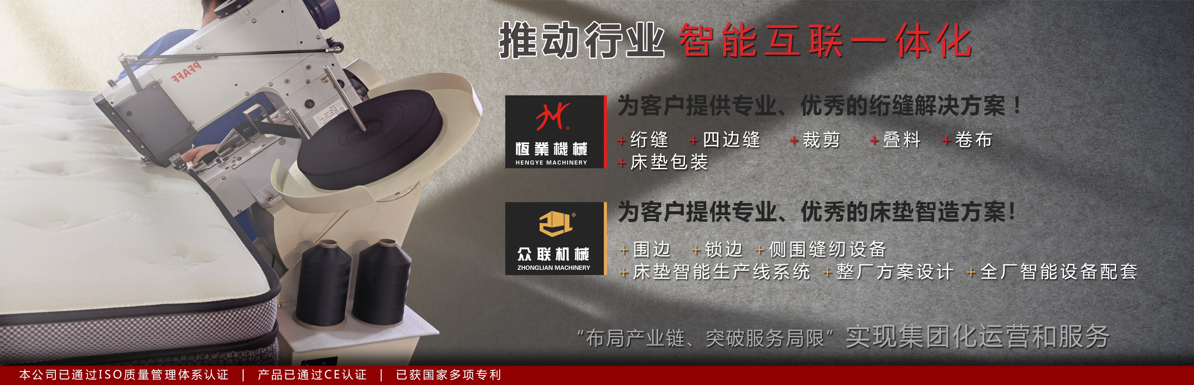 “布局產(chǎn)業(yè)鏈、突破服務(wù)局限”。聯(lián)合“佛山.眾聯(lián)機(jī)械科技”,實(shí)現(xiàn)集團(tuán)化運(yùn)營和服務(wù),從原材料到成品床墊入庫的全套智能生產(chǎn)設(shè)備及工藝方案,我們可以提供滿格服務(wù),為客戶提供專業(yè)、優(yōu)秀的床墊智造方案。